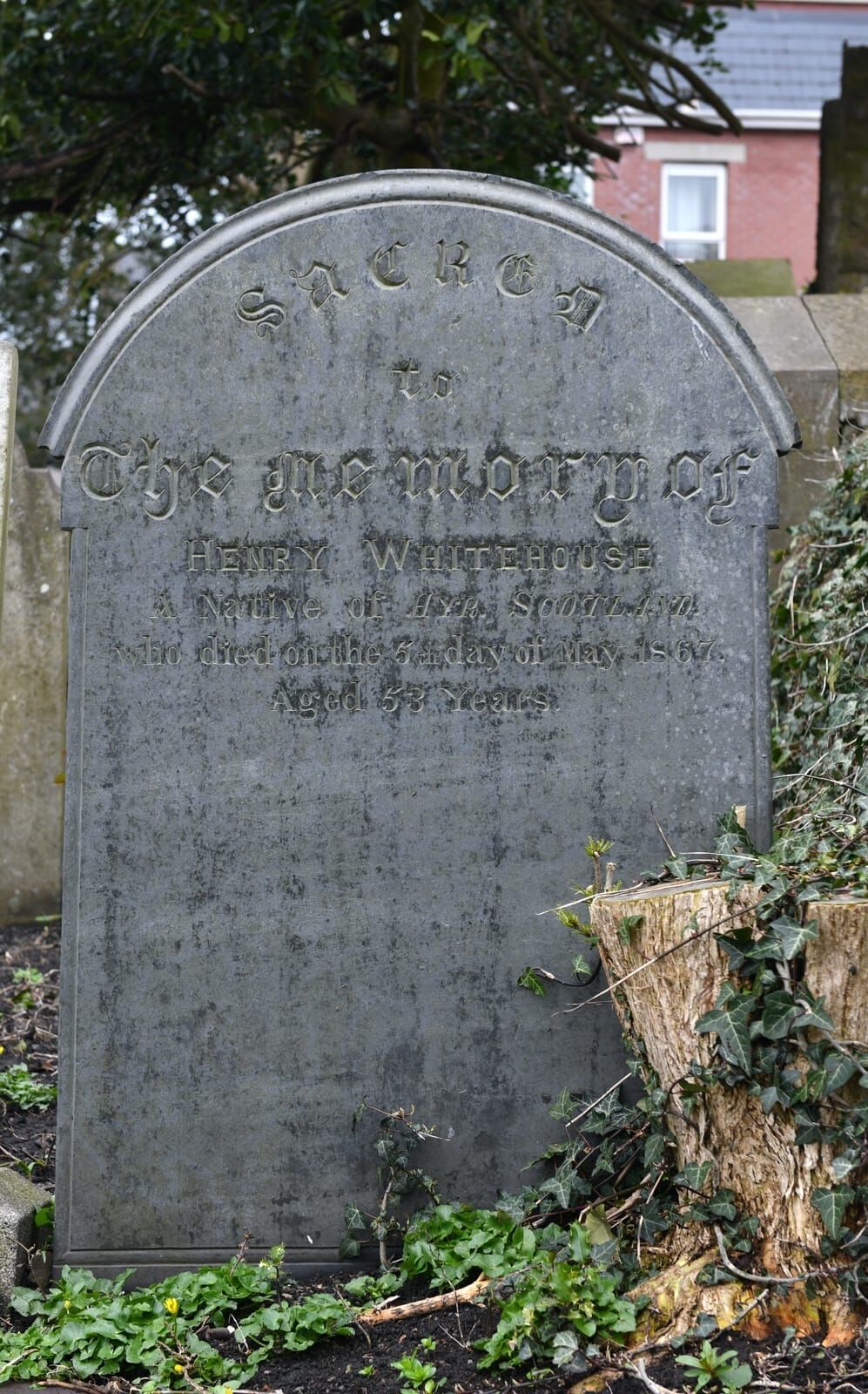 Sacred to the memory of Henry Whitehouse a native of Ayr, Scotland who died on the 5th day of May 1867 aged 53 years