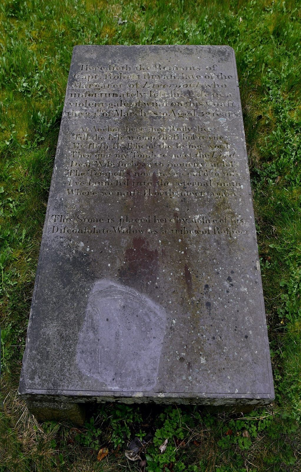 Here lieth the remains of Captn. Robert Bryan, late of the “Margaret” of Liverpool who unfortunately lost his life in a violent gale of wind on this coast the 24th of March 1810 aged 32 years.