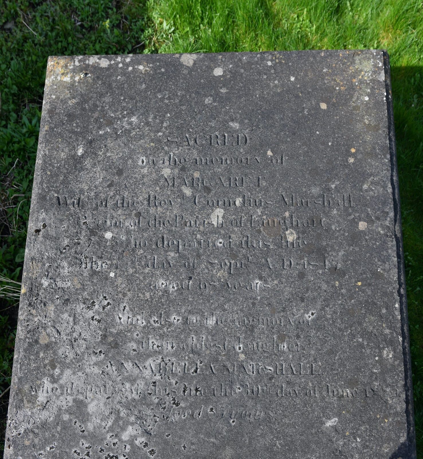 Sacred to the memory of Margaret wife of Revd . Cornelius Marshall Rector of the Parish of Faughart who departed this life the 13th day of Septr. A.D. 1847, aged 68 years
