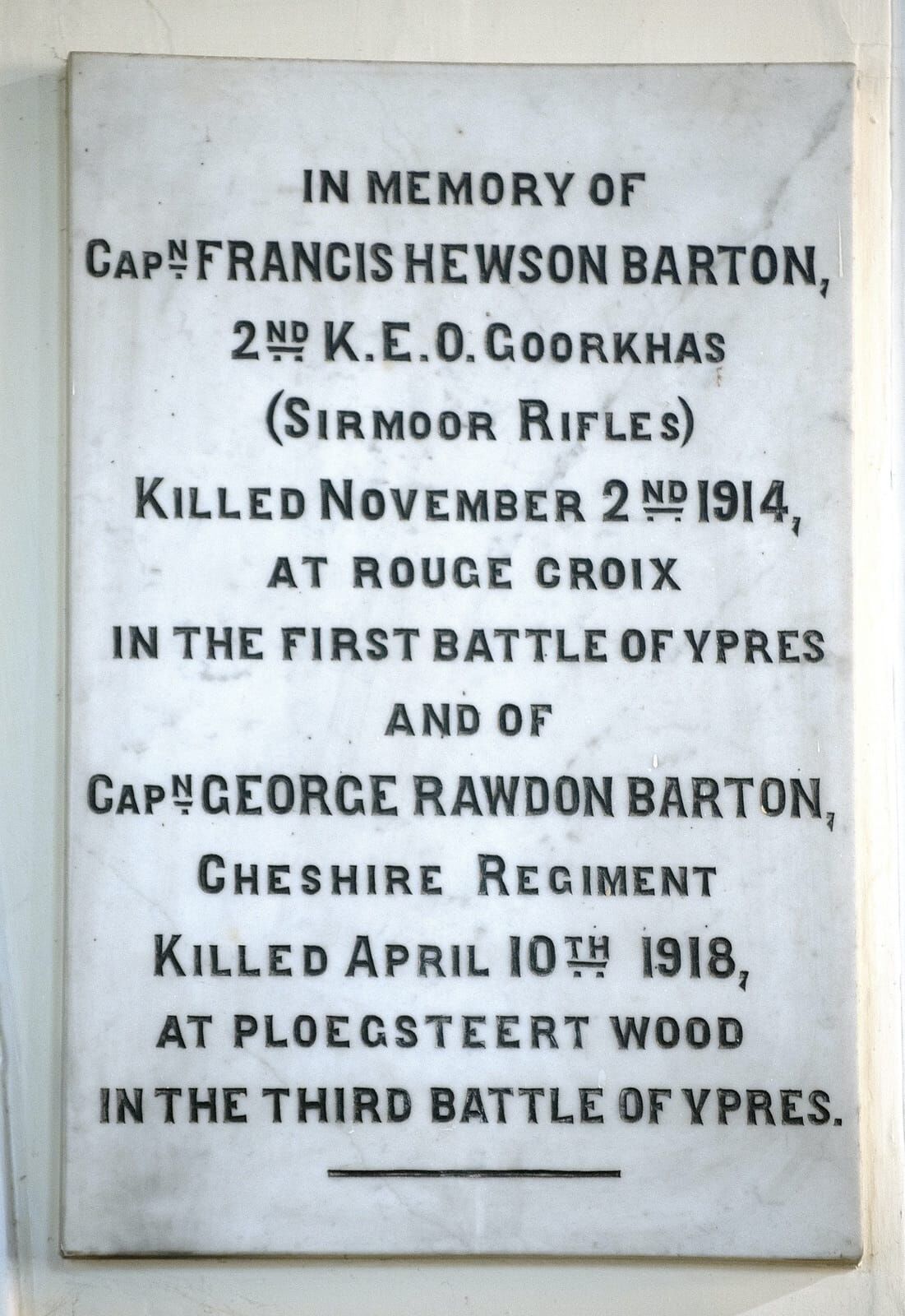 In memory of Capn Francis Hewson Barton, 2nd K.E.O. Gurkhas (Sirmoor Rifles) killed November 2nd 1914, at Rouge Croix in the first battle of Ypres and of Capn George Rawdon Barton, Cheshire Regiment killed April 10th 1918 at Ploegsteert Wood in the third battle of Ypres.