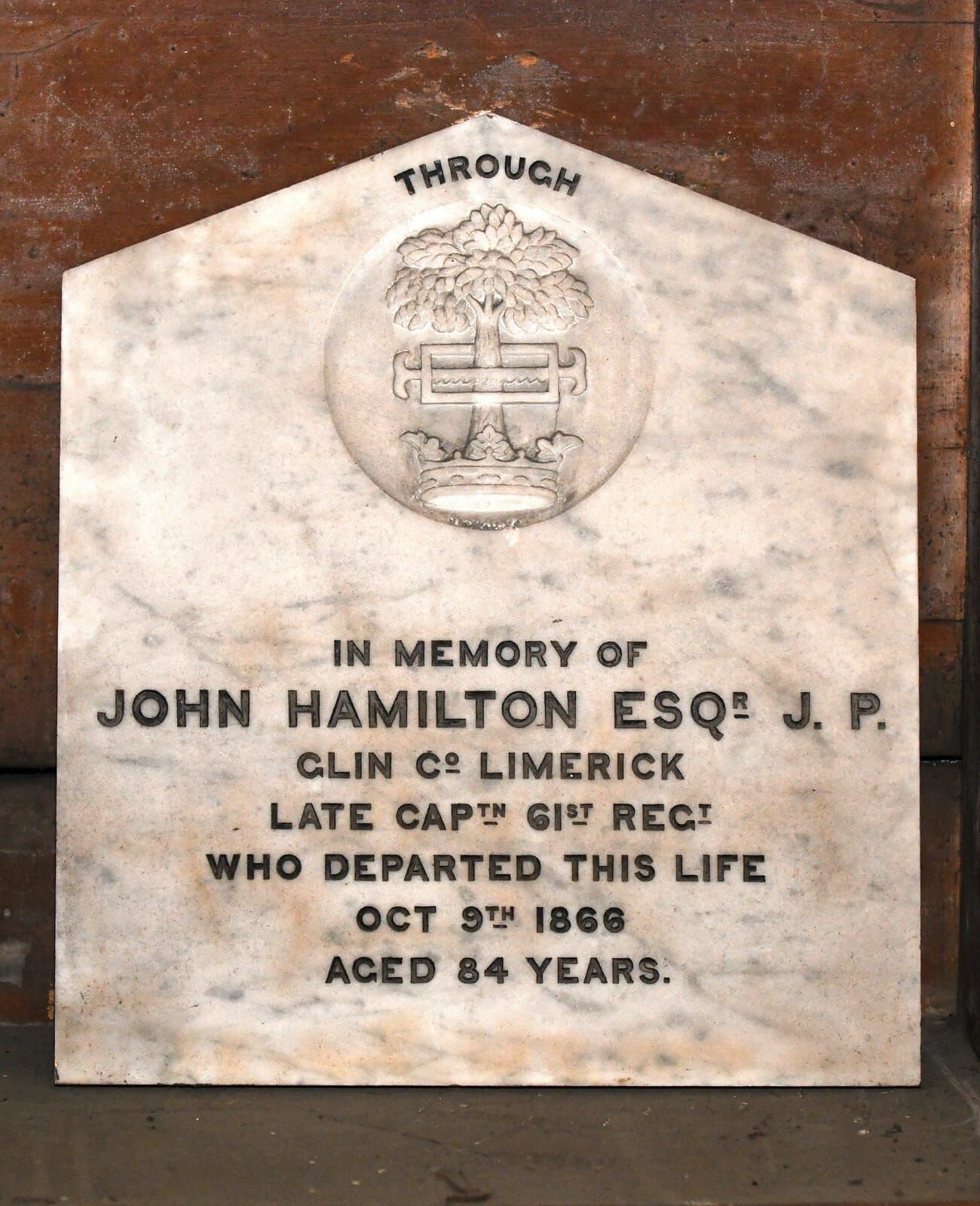 In memory of John Hamilton, Esqr J.P. Glin Co. Limerick late Captain 61st Regt. who departed this life Oct. 9th. 1866 aged 84 years.[This tablet was found in a cupboard in the north gallery, and is not wall-mounted]