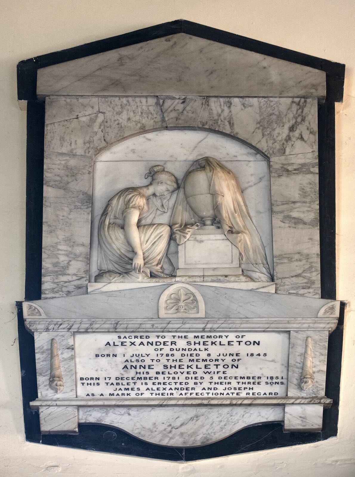 Sacred to the memory of Alexander Shekleton of Dundalk born 1 July 1786 died 8 June 1845. Also to the memory of Anne Shekleton his beloved wife born 17 December 1781 died 5 December 1851. This tablet is erected by their three sons James, Alexander and Joseph as a mark of their affectionate regard. J.R. Kirk sculpt.