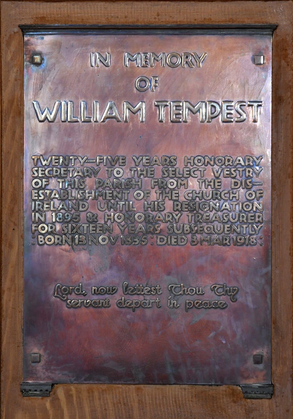 In memory of William Tempest twenty-five years honorary secretary to the Select Vestry of this parish from the disestablishment of the Church of Ireland until his resignation in 1895 & honorary treasurer for sixteen years subsequently: born 13 Nov 1835, died 3 Mar 1918. Lord now lettest Thou thy servant depart in peace.