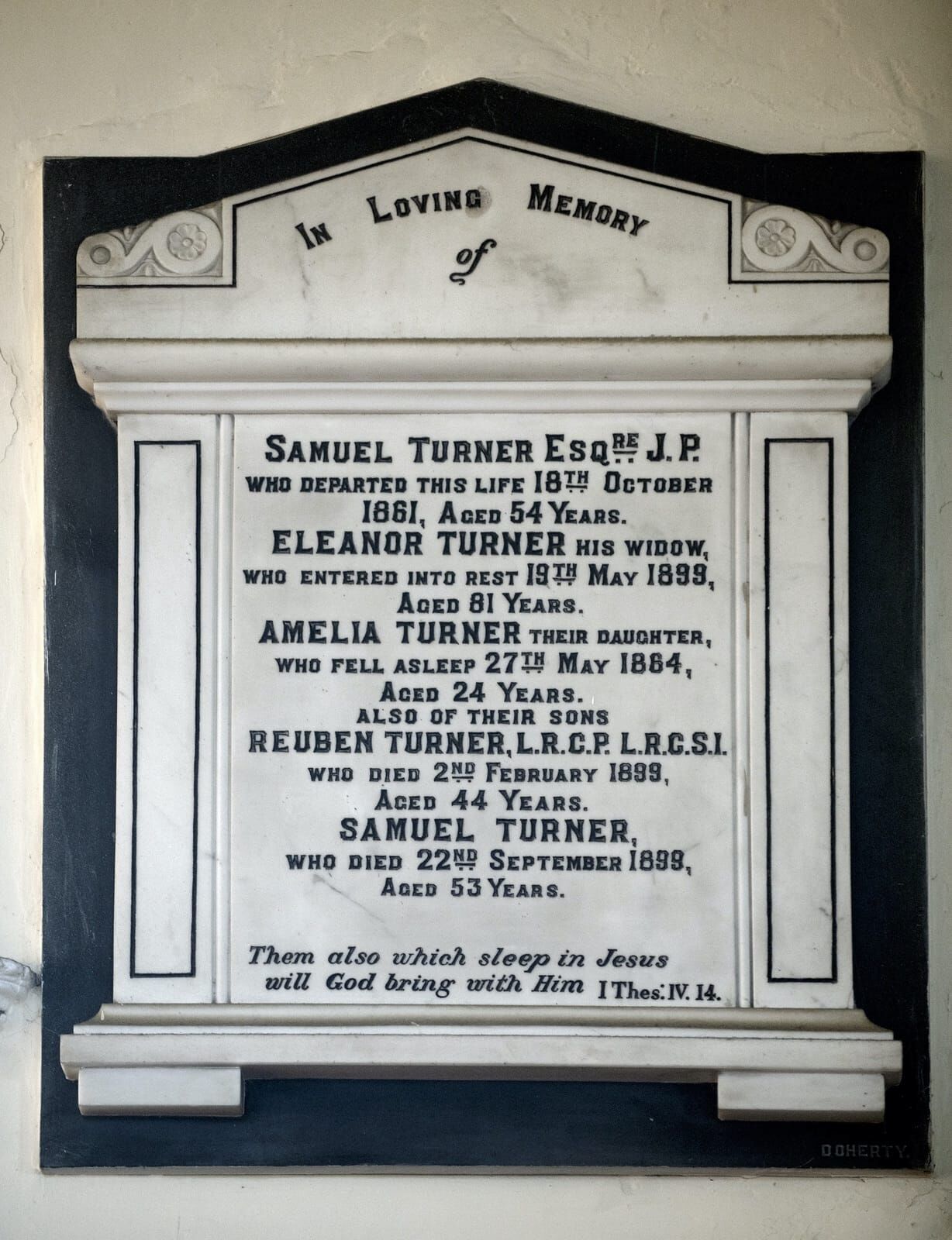 In loving memory of Samuel Turner Esqre J.P. who departed this life 18th October 1861, aged 54 years. Eleanor Turner his widow, who entered into rest 19th May 1899, aged 81 years. Amelia Turner, their daughter, who fell asleep 27th May 1884, aged 24 years. Also of their sons Reuben Turner, L.R.C.P., L.R.C.S.I. who died 2nd February 1899, aged 44 years. Samuel Turner, who died 22nd September 1899, aged 53 years. Them also which sleep in Jesus will God bring with Him. 1 Thes. IV, 14. Doherty.