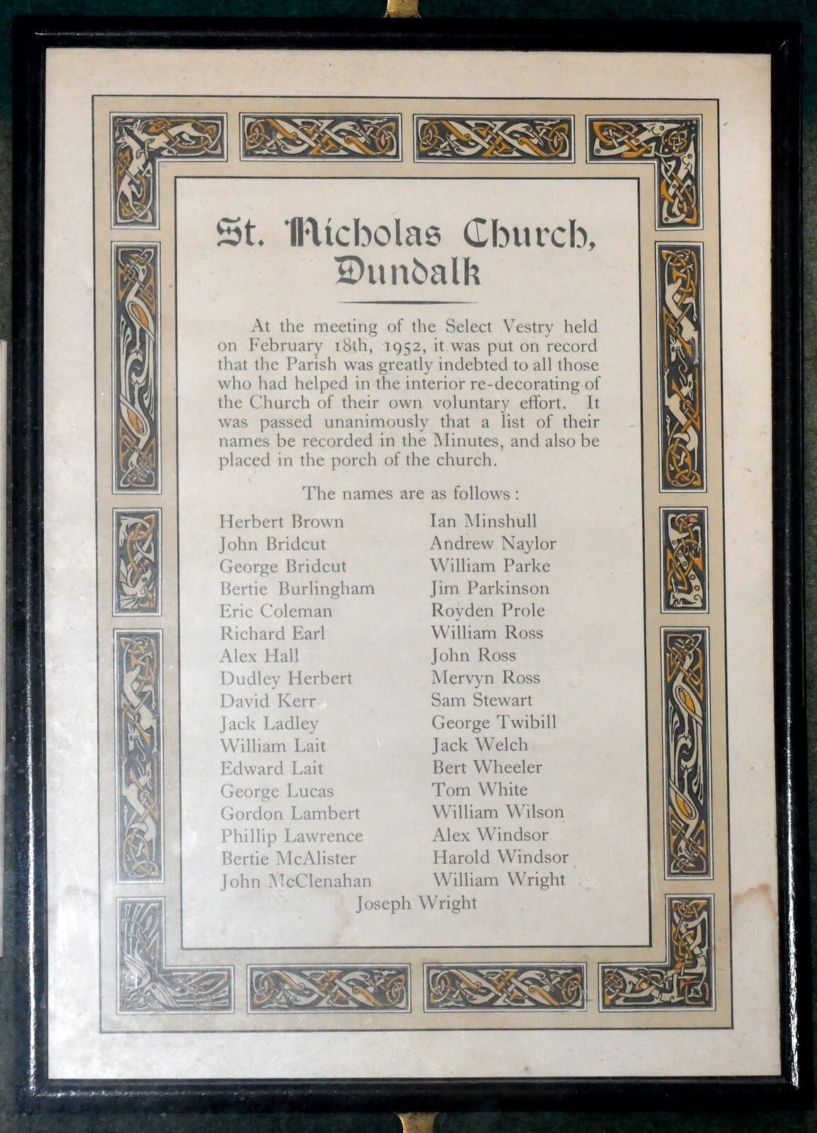 At the meeting of the Select Vestry held on February 18th, 1952, it was put on record that the Parish was greatly indebted to all those who had helped in the interior re-decorating of the church of their own voluntary effort. It was passed unanimously that a list of their names be recorded in the Minutes, and also be placed in the porch of the church. Their names are as follows: Herbert Brown