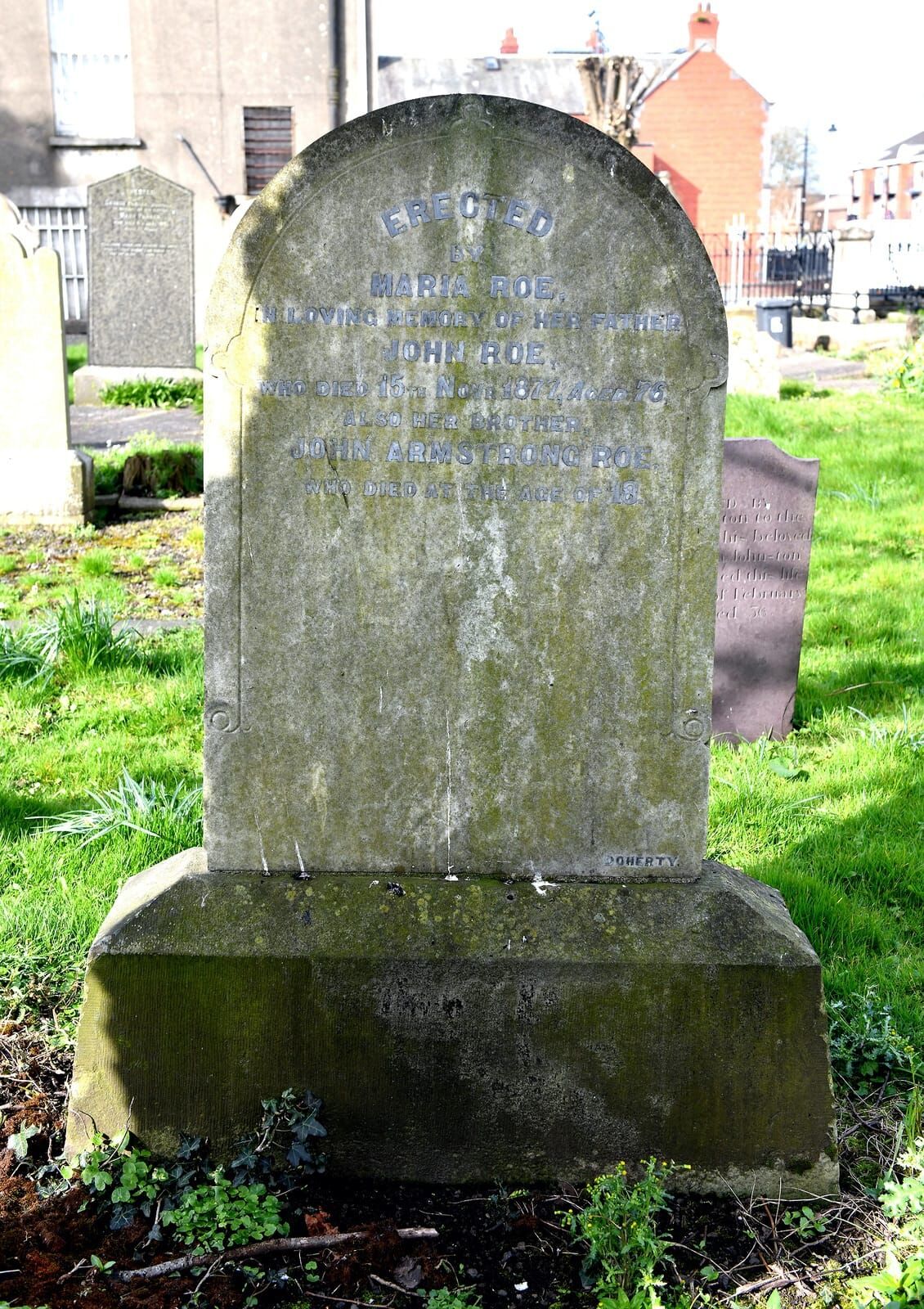 Erected by Maria Roe in loving memory of her father John Roe who died 15th Novr. 1877 aged 76
