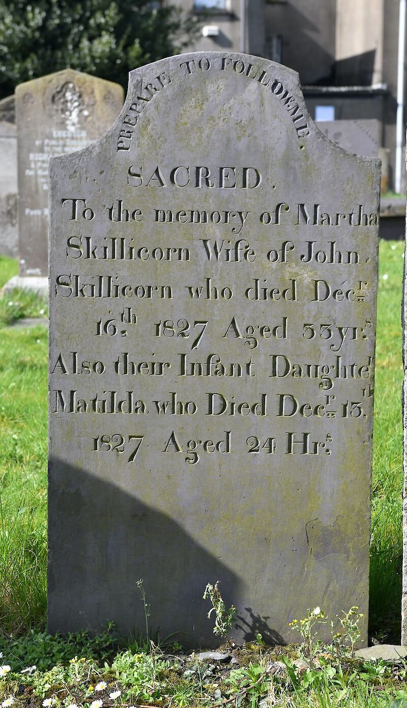 Prepare to follow me.Sacred to the memory of Martha Skillicorn wife of John Skillicorn who died Decr 16th 1827 aged 33 yrsAlso their infant daughter Matilda who died Decr 13th 1827 aged 24 hrs.
