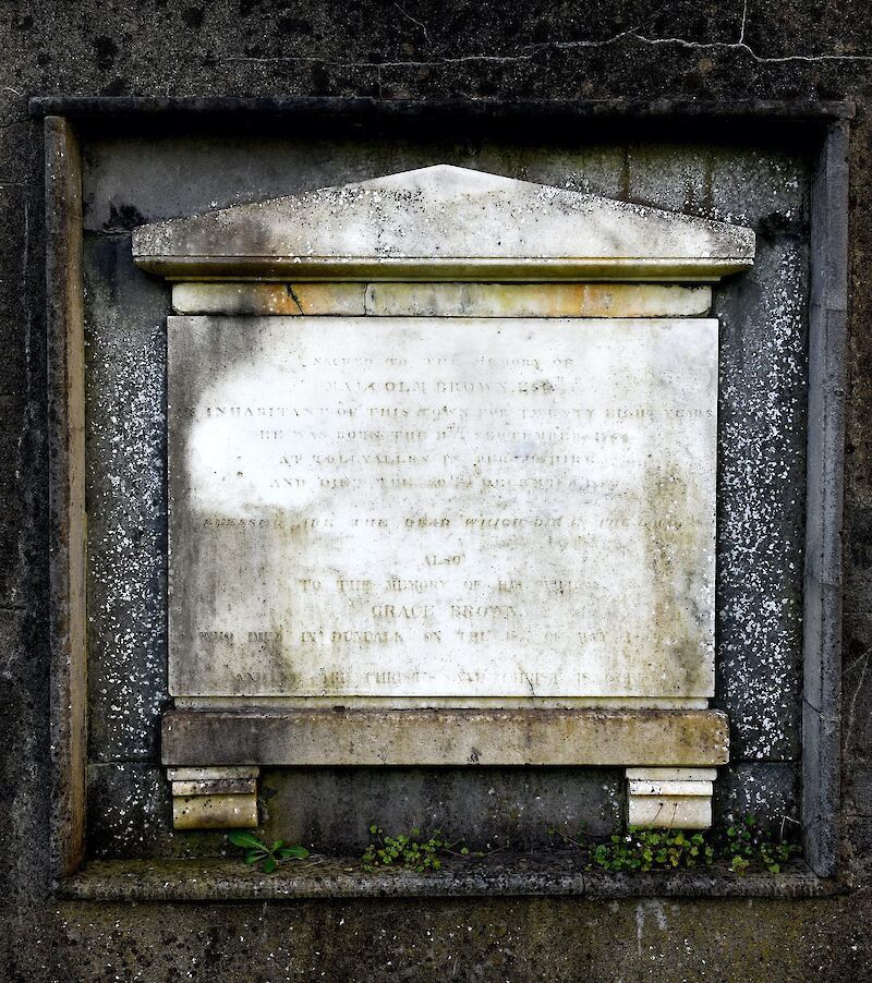 (Marble slab in wall)Sacred to the memory of Malcolm Brown Esq an inhabitant of this town for twenty eight yearsHe was born 11th September, 1764 at Tullyallen in Perthshire and died the 20th December…