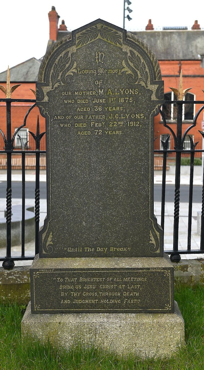 In loving memory of our mother M.A. Lyons who died June 1st 1875 aged 36 years and of our father J.C. Lyons who died Feby. 22nd 1912 aged 72 years